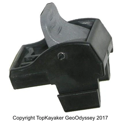 Best used for a replacement part on Wilderness Systems kayaks outfitted with the Phase 3 Air Pro outfitting. This part is used to adjust the seat back height. The Phase 3 Air Pro Web Cleat (strap clasp) is 1 3/8 inches front to back, 1 inch wide, and has a gray lever and icon showing the back raising and lowering. This part is a spring loaded cam-lock. It snaps into the front edge of the center of the Air Pro leg lifter. A length of 3/4 Inch Webbing Strap passes through it.