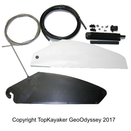 Retractable Plastic Skeg System Pro, complete kit, by KajakSport. Best used for kit kayaks and custom install, by an experienced kayak mechanic or skilled handy person. (Warning! Modifications below the water should not be taken lightly.) Kit Includes: injection molded NO Flange skeg box and skeg blade, AISI 316 wire (3mm = 1/8 in.), PA tube (6/4 mm = ¼ in.) and the injection molded skeg control unit with hardware. Comes with detailed instructions in English (use link to preview). Read instructions to learn about with flange vs no flange. Skeg box is 15 1/8 inches long. Skeg blade is 14 inches at the longest axis. Control unit is 6 inches long, outside kayak, and 6 7/8 max inside the kayak. The instruction link above will provide schematic diagrams.