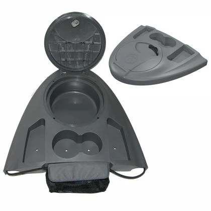 Fits most models of recreational kayak, and some touring kayaks. Komplete Konvenience, Kleverly Krafted. Fits assorted kayaks such as; Wilderness Systems Pungo, Old Town Otter and Heron plus many more. Not suitable for the very pointed cockpit shapes of some Old Town Loon kayaks. Konsole will not fit the Wilderness Systems Tsunami. Send back if not a fit. This is a standard feature on the Wilderness Systems Pungo kayak. The Kayak Konsole offers ease of use and functionality all in one. The inspired water tight hinged hatch with built-in cam levers seals for dry storage and offers easy access to contents, the universal cup holders accommodate everything from travel mugs to 32 oz bottles. Includes recessed mounting surfaces for rod holder mounts and a mesh pocket. This konsole will fit most recreational kayak cockpits and secures via bungee cord under the rim coaming of the cockpit, or additionally secured with 2 well-nuts. (Note: removal of the well-nuts may make for a better fit.) The Konsole is 19 inches wide and is 16 inches from the forward most edge to the aft end. (alt pn 8025220, 8023016 and 8023017)