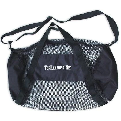 The perfect size 28 in. gear bag to handle your kayak accessories. Enough room to handle a paddler’s PFD, backrest, knee straps, bowline, paddle leash, or… spray skirt, bilge pump, paddle float, tow system… and some assorted small stuff. Or use to store several PFDs at a time, or a whole bunch of assorted accessories. A mesh gear bag is also good for wet kayaking clothes, shoes, hats and gloves. Handy for dive and snorkel gear too. The full mesh netting allows sand to fall out, rinse water to flow in and is good for air drying. Helps prevent mildew. Features a heavy-duty, full-length plastic zipper, strong net mesh, removable shoulder strap, handles, and fabric side panels. 28 inches long by 14 inches in diameter.
