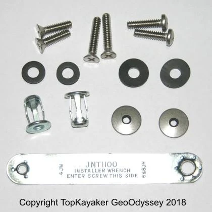 Use this Fastener Boss Repair Kit to replace damaged nut inserts molded into the plastic kayak hulls for screws that secure common deck fitting onto locations that hard to reach inside. Comes with two each (10-24); Jack Nuts, 3/4 inch Pan Head Screws, 3/4 inch Flat Head Screws, 1 inch Flat Head Screws, 10-32 Neoback Washers, 5/8 inch Rubber Washers, 1/4×1/2 inch Rubber Washers and just one JNT1100 Wrench, with detailed instructions.