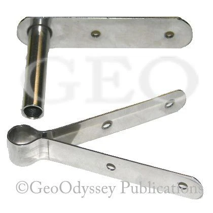 The gudgeon has an adjustable two part construction, made of stainless steel. See Large Image for alternative view to understand the adjustable nature of the item. A Takes a 3/8 inch rudder pin. B 2 3/8 inches high. C 3 ¼ inch flexible side V-bar. D 4 inch rigid top deck plate. E 1 inch wide. 6 total screw holes drilled for rivets, 10-32 pan head machine screws, or no. 10 stainless steel self-tapping screws. (Two top holes 1 ¾ inches on center, two each side 1 ½ inches on center.)